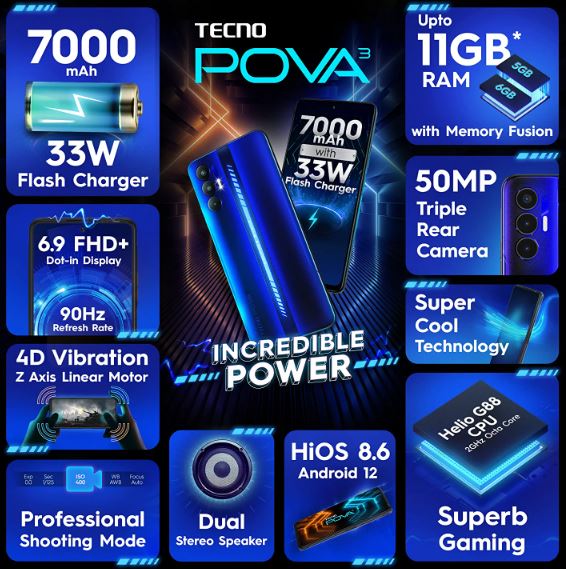 Tecno Pova 3 मोबाइल को 25 मई 2022 को भारत में लॉन्च किया गया था। इस फोन में आपको 6.90-इंच टचस्क्रीन डिस्प्ले मिलता है, जिसमें 90 Hz रिफ्रेश रेट, 1080x2460 पिक्सल रेज़ॉल्यूशन दिया गया है। इस फोन में ऑक्टा-कोर मीडियाटेक हीलियो G88 प्रोसेसर भी है, जिसमें 6GB तक रैम और 128GB तक इनबिल्ट स्टोरेज मिलता है। बैटरी की बात करें तो इसमें 7000mAh की नॉन-रिमूवेबल बैटरी है। Tecno Pova 3 के रियर पैनल पर 50 मेगापिक्सल का ट्रिपल कैमरा सेटअप भी है। सेल्फी के लिए इसमें 8-मेगापिक्सल का सेल्फी सेंसर दिया गया है।