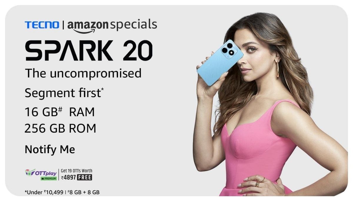 टेक्नो का बिग रैम और रोम वाला फोन भारत में लॉन्च होने जा रहा है। दरअसल हम यहां Tecno Spark 20 की बात कर रहे हैं। इस फोन का डेडिकेटेड लैंडिग पेज अमेजन पर तैयार हो चुका है। भारतीय ग्राहकों के लिए यह फोन फ्री OTT प्लेटफॉर्म बेनेफिट्स के साथ लाया जा रहा है। यूजर्स 19 OTT प्लेटफॉर्म का मजा फ्री में ले सकेंगे।