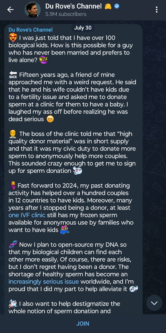 टेलीग्राम पोस्ट में उन्होंने लिखा ''मुझे अभी पता चला है कि मेरे 100 से ज्यादा बायोलॉजिकल बच्चे हैं। यह किसी ऐसे व्यक्ति के लिए कैसे संभव है जो कभी शादी नहीं करता और अकेले रहना पसंद करता है। इतने बच्चों के पिता बनने के पीछे की कहानी क्या है। उन्होंने पोस्ट में इस बात का भी जिक्र किया है। Pavel Durov के मुताबिक, स्पर्म डोनर बनने की कहानी की शुरुआत आज से 15 साल पहले हुई थी।