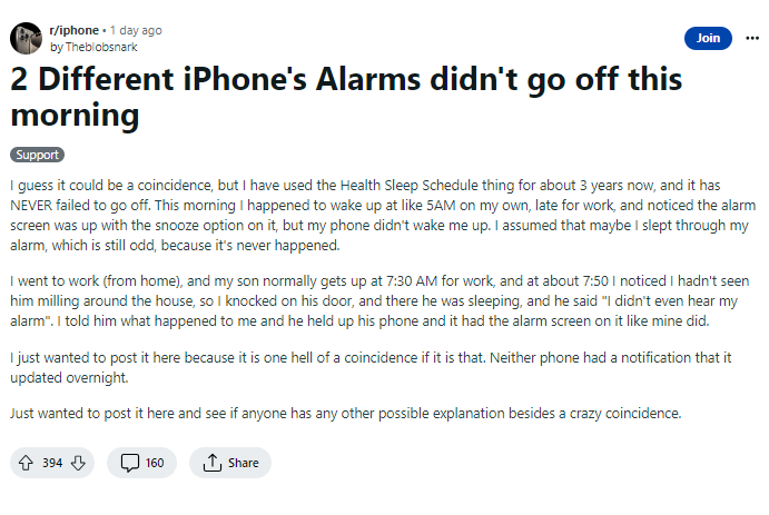 - एक यूजर ने बताया कि उनके अलार्म भी बंद नहीं हुए। इतना ही एक ही रात में कई iPhone बंद हो गए, और अलार्म के निर्धारित समय पर बंद न होने के पीछे यही कारण हो सकता है। इस iPhone यूजर्स के लिए अलार्म बजने से ठीक एक मिनट पहले यह वापस चालू हो गया।