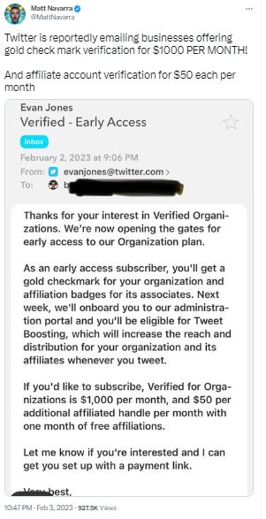 एक सोशल मीडिया सलाहकार मैट नवारा ने ट्विटर पर मोनिटाइजेशन के प्रोडक्ट प्रबंधक इवान जोन्स के ईमेल का एक स्क्रीनशॉट साझा किया किया जो कि व्यवसायिक संगठन के लिए सत्यापन के शुरुआती एक्सेस प्रोग्राम के बारे में है, जिसमें यूजर्स को सूचित किया गया है कि इसकी लागत 1000 डॉलर प्रति माह होगी। साथ ही, संबद्ध खातों की कीमत प्रति माह 50 डॉलर प्रति खाता होगी, लेकिन कस्टमर्स को एक महीने की मुफ्त संबद्धता मिलेगी।
