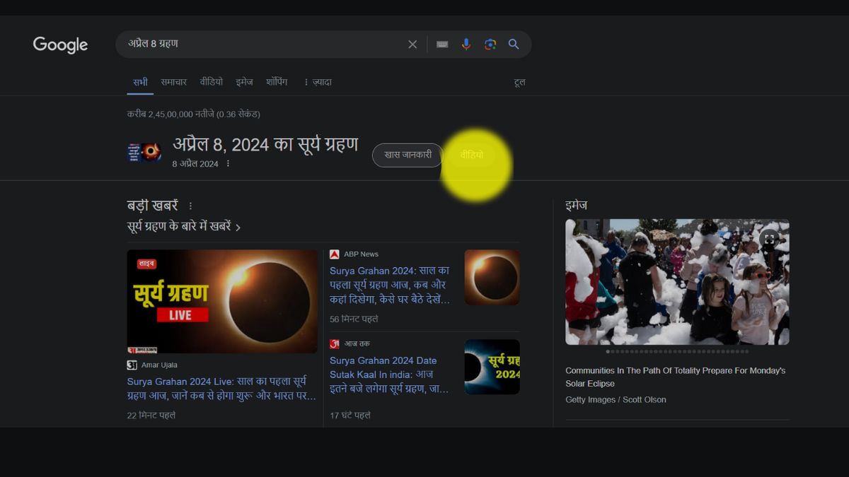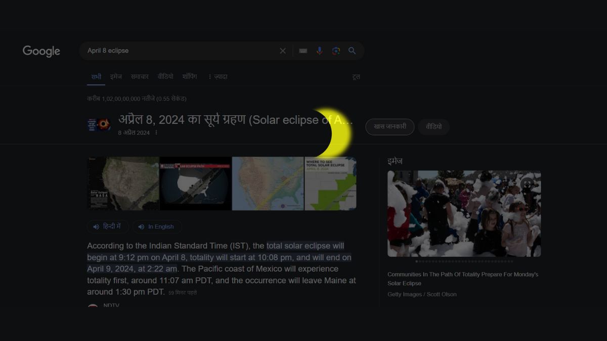 आज यानी 8 अप्रैल 2024 को साल का पहला सूर्य ग्रहण लगने जा रहा है। इस खगोलीय घटना को आप भी अपने फोन लैपटॉप-पीसी में देख सकते हैं। दरअसल गूगल ने सूर्य ग्रहण को एनिमेशन के जरिए दिखाने की कोशिश की है। गूगल सर्च इंजन का इस्तेमाल कर ग्रहण एनिमेशन देखा जा सकता है। इसके लिए आपको इंग्लिश और हिंदी कीवर्ड इस्तेमाल करने होंगे।