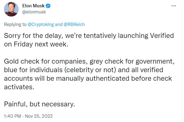 मस्क ने बताया की कंपनियों के लिए गोल्ड चेक, सरकार के लिए ग्रे चेक, व्यक्तियों के लिए नीला चेक होगा। इसके अलावा सभी वेरिफाइड अकाउंट को मैन्युअली प्रमाणित किया जाएगा।