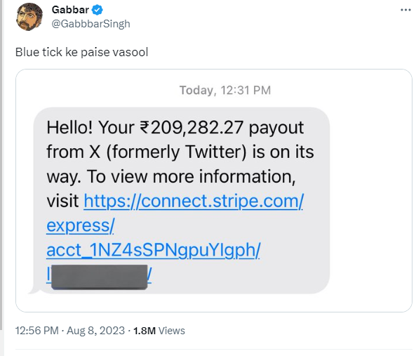 कई यूजर्स ने X द्वारा अपने बैंक खातों में जमा की गई राशि के स्क्रीनशॉट पोस्ट किए और अपनी उत्तेजना और खुशी व्यक्त की। ऐसे ही एक क्रिएटरअभिषेक अस्थाना, जो @GabbbarSingh हैंडल से चलते हैं ने कहा कि उन्होंने अपने द्वारा बनाए गए इंप्रेशन के कारण लगभग 2.1 लाख रुपये कमाए।