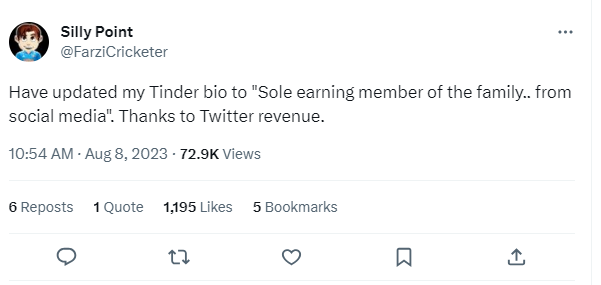 'मैथून' नाम के यूजर ने एक स्क्रीनशॉट शेयर किया है जिसमें दावा किया गया है कि उसके बैंक खाते में 3,51,000 रुपये जमा किए गए हैं। एक अन्य यूजर ने मजाक में कहा कि मैंने अपना टिंडर बायो अपडेट करके सोशल मीडिया से कमाने वाला परिवार का एकमात्र सदस्य कर दिया है। ट्विटर रेवेन्यू को धन्यवाद।