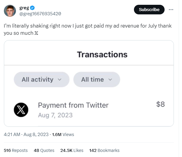 Got my Ads revenue from @X, @elonmusk you beauty. ❤️🔥 pic.twitter.com/fVO23VTmLR