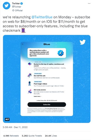 बीते रविवार कंपनी ने अपने अधिकारिक ट्विटर अकाउंट पर जानकारी दी कि वो आज यानी सोमवार 12 दिसंबर को अपनी ट्विटर ब्लू की शुरुआत फिर से करेगी। कंपनी ने कहा कि हम सोमवार को @TwitterBlue लॉन्च कर रहे हैं - सब्सक्राइबर-ओनली फीचर्स को एक्सेस करने के लिए $8/माह या iOS $11/महीने के लिए वेब पर सब्सक्राइब करें। आइये जानते है कि आपको इसके साथ क्या-क्या फायदे मिलते हैं।