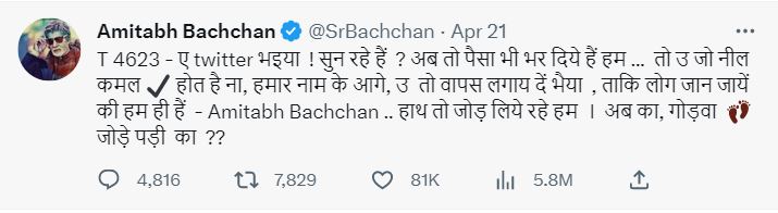 भारत के मशहूर बॉलिवुड स्टार अमिताभ बच्चन ने ट्विटर पर एक पोस्ट लिख अपने ब्लू टिक की वापिसी की मांग की। हालांकि, फी पे करने के कुछ समय बाद उनके अकाउंट पर ब्लू टिक की वापिसी भी हो गई।