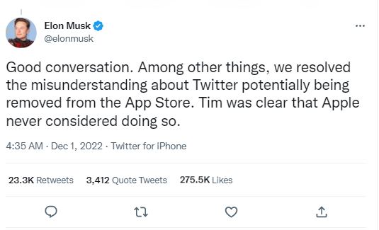 इस पोस्ट के बाद मस्क ने ऐपल के CEO टिम कुक से मुलाकात की और इस बात की पुष्टि की है कि ऐपल ट्विटर को हटाने को लेकर कोई कदम नहीं उठा रही है। यह बस एक गलतफहमी थी। बता दें कि कंपनी ने एंड्रॉयड के लिए ब्लू सब्सक्रिप्शन सर्विस की कीमत को लेकर अब तक कोई जानकारी नहीं दी है।