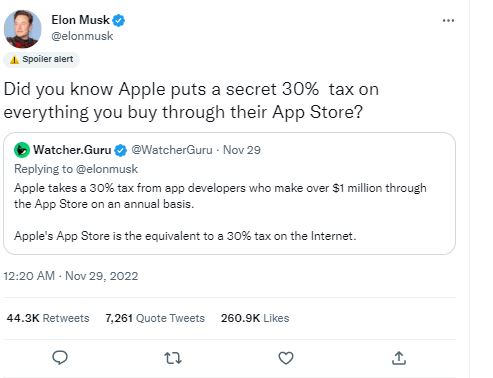 बता दें कि कुछ दिनों पहले Elon Musk ने अपने आधिकारिक ट्विटर हैंडल पर एक पोस्ट डाला था, जिसमें उन्होंने 30% टैक्स की निंदा की थी। इसके बाद खबर आई थी की ऐपल अपने ऐप स्टोर से Twitter ऐप से हटाने की बात कही थी।