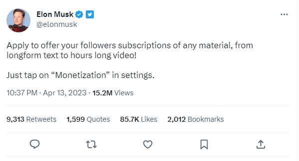 Twitter के CEO एलन मस्क ने अपने ट्विटर हैंडल पर बताया कि आप कैसे मॉनिटाजेशन टैब का उपयोग कर सकते हैं। बता दें कि अब ट्विटर यूजर्स अपने फॉलोवर्स के लिए पेड सब्सक्रिप्शन पेश कर रहा है। आइये इसके बारे में जानते हैं।