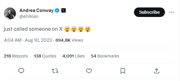 उनकी पुष्टि एक्स डिजाइनर एंड्रिया कॉनवे द्वारा पोस्ट किए जाने के एक दिन बाद आई है। अभी-अभी एक्स पर किसी को कॉल किया है, जिसके बाद हैड एक्सप्लोडिंग इमोजी आए। उस समय, यह स्पष्ट नहीं था कि वह किसका जिक्र कर रही थी: वॉयस कॉल या वीडियो कॉल या दोनों।