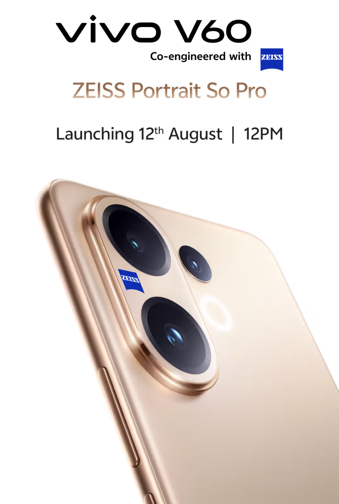 वीवो वी60 स्मार्टफोन भारत में 12 अगस्त को लॉन्च होगा जो वीवो वी50 की जगह लेगा। इसमें स्नैपड्रैगन 7 जेन 4 चिपसेट 50MP Zeiss सुपर टेलीफोटो कैमरा और 6500mAh की बैटरी होगी। यह फोन Auspicious Gold Mist Gray और Moonlit Blue कलर में उपलब्ध होगा। फोटोग्राफी के लिए Zeiss के साथ पार्टनरशिप जारी है।