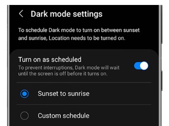 आप डार्क मोड को चाहें तो हर समय ऑन रख सकते हैं या फिर सूर्यास्त के बाद का समय भी रख सकते हैं। इससे फोन में शाम होते ही डार्क मोड अपने आप ऑन हो जाता है। इसके अलावा आप समय भी सेट कर सकते हैं कि कब इसे ऑन करना है और कब ऑफ़ रखना है।