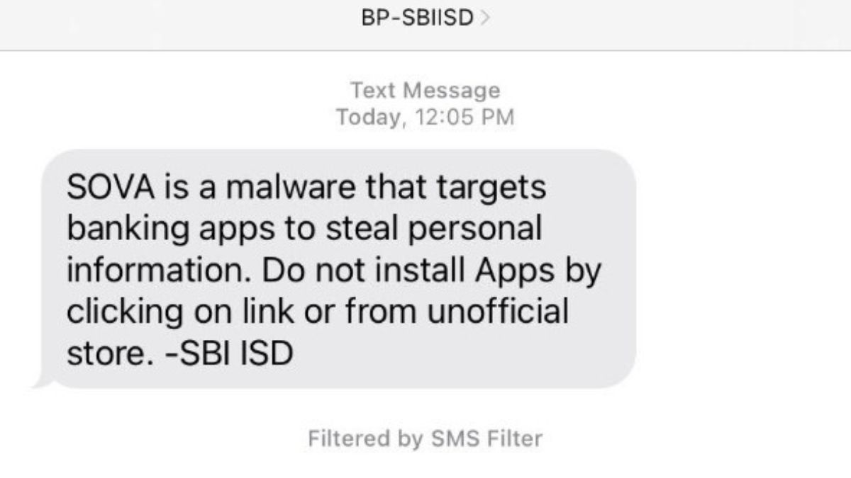 SBI अपने कस्टमर्स को SOVA वायरस के बारे में मैसेज कर रहा है, जिसमें उसने बताया है कि SOVA एक एंड्रॉयड-आधारित ट्रोजन मैलवेयर है। यह कस्टमर्स के पर्सनल डाटा चोरी करने के लिए फेक बैंकिंग ऐप का उपयोग करने वाले लोगों को टारगेट कर रहा है। बता दें कि SOVA आपके क्रेडेंशियल्स को चुराता है।