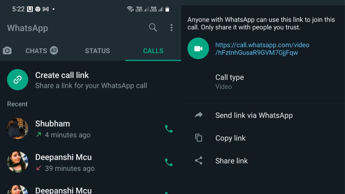 अगर आप इस विकल्प पर क्लिक करते हैं, तो एक लिंक स्वतः उत्पन्न हो जाएगा। इसके साथ ही यूजर कॉल टाइप - ऑडियो या वीडियो भी चुन सकते हैं।इसके नीचे आपको तीन विकल्प मिलेंगे, जिसमें वॉट्सऐप के माध्यम से एक लिंक भेजें, लिंक कॉपी करें और लिंक शेयर करें। एक बार जब यूजर लिंक पर क्लिक करता है, तो दो विकल्प होंगे- ज्वाइन और लीव।इसके साथ ही यूजर्स को वीडियो कॉल के दौरान ऑडियो म्यूट करने और वीडियो छिपाने का विकल्प मिलता रहेगा।