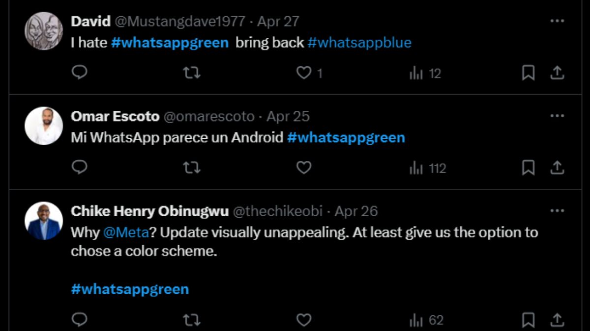 वॉट्सऐप के नए बदलाव को लेकर यूजर्स माइक्रोब्लॉगिंग प्लेटफॉर्म एक्स पर बात कर रहे हैं। हैशटैग WhatsappGreen के साथ यूजर्स वॉट्सऐप के नए ग्रीन कलर को लेकर अपनी पसंद-नापसंद बता रहे हैं। मालूम हो कि अभी तक आईओएस यूजर्स को वॉट्सऐप ग्रीन के बजाय ब्लू थीम पर बेस्ड मिलता था। वहीं एंड्रॉइड यूजर्स को पहले से ही वॉट्सऐप ग्रीन कलर थीम पर मिलता है।