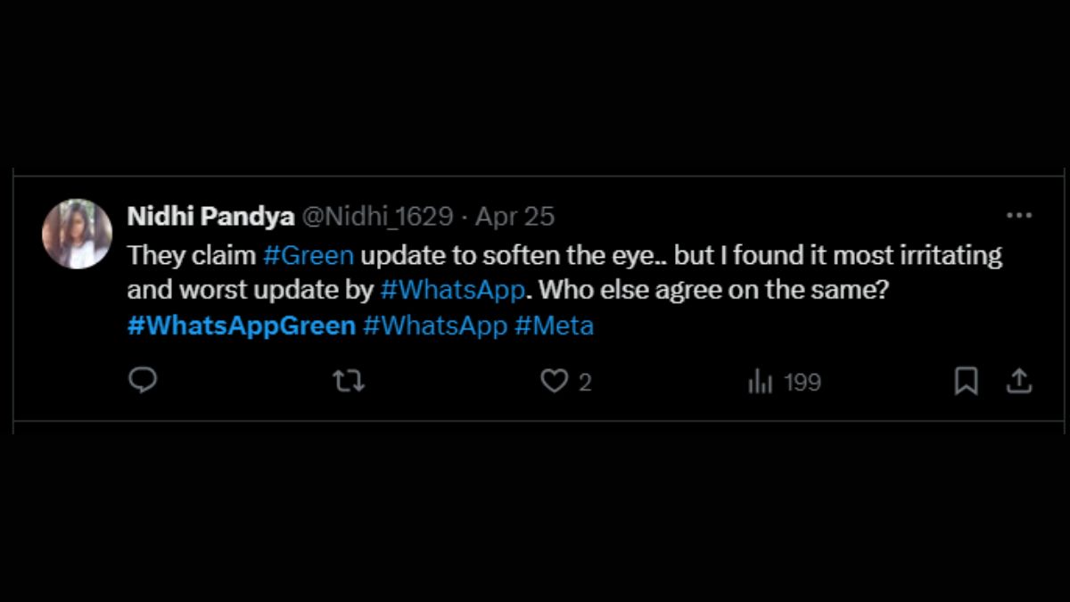 वॉट्सऐप का दावा है कि इस नए बदलाव को यूजर की आंखों का ख्याल रखते हुए लाया गया है। वहीं, यूजर्स का कहना है कि वॉट्सऐप का ग्रीन होना और ज्यादा इरिटेट कर रहा है।