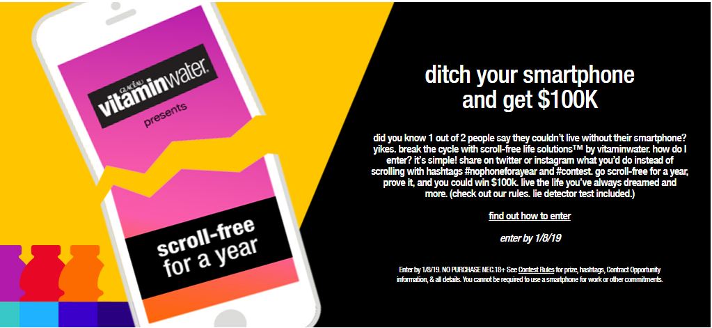 नई दिल्ली (टेक डेस्क)। पहले मोबाइल फोन, फिर स्मार्टफोन का लत इन दिनों सभी को है। स्मार्टफोन हमारे लिए एक जरूरत का सामान बन गया है। अगर, आपसे कोई कहे कि आपको स्मार्टफोन के बिना कुछ घंटे या कुछ दिन रहना है तो आपके लिए रहना मुश्किल हो जाता है। लेकिन कोका-कोला कंपनी के सब ब्रांड बिटामिन वाटर ने एक ऑफर निकाला है, जिसके तहत अगर आप एक साल तक यानी कि 365 दिनों तक स्मार्टफोन का इस्तेमाल किए बिना रह सकते हैं तो आपको 1 लाख अमेरिकी डॉलर यानी करीब 72 लाख रुपये का ईनाम दिया जाएगा।