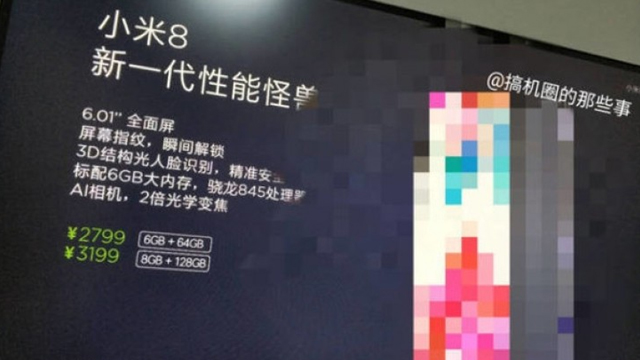 Mi 8 के संभावित स्पेसिफिकेशन्स : लीक हुई तस्वीर में शाओमी Mi 8 के जो स्पेसिफिकेशन्स सामने आए हैं उसके मुताबिक, इस स्मार्टफोन में 6.2 इंच का फुल एचडी डिस्प्ले दी गई है जिसका रेजोल्यूशन 2280 x 1080 पिक्सल है। वहीं इसके स्क्रीन का असपेक्ट रेशियो 18:9 है। यह स्मार्टफोन एंड्रॉइड ओरियो 8.1 ओरियो पर रन करेगा। लीक हुई तस्वीर के मुताबिक इसमें स्नैपड्रैगन 845 प्रोससर दिया गया है। वहीं इसमें 6 जीबी रैम और 128 जीबी इंटरनल मेमोरी दिया गया है। स्मार्टफोन को पावर देने के लिए 3,300 एमएएच बैटरी दी गई है। कैमरे की बात करें तो इसमें 16 मेगापिक्सल का सेल्फी कैमरा दिया गया है। वहीं बैक में 20 मेगापिक्सल और 16 मेगापिक्सल का डुअल रियर कैमरा दिया गया है। इसके अलवा सिक्योरिटी के लिए अंडर डिस्प्ले फिंगरप्रिंट स्कैनर भी दिया गया है। वहीं यह भी अफवाह है कि यह पहला एंड्रॉइड फोन होगा जिसमें 3-डी फेसियल स्कैनिंग दी गई है। वहीं अफवाह यह भी है कि यह स्मार्टफोन 6जीबी और 8जीबी रैम वाले दो वेरिएंट में लॉन्च की जा सकती है। 6 जीबी रैम वाले वेरिएंट की कीमत करीब 439 अमेरिकी डॉलर (29,852 रुपये) और 8 जीबी रैम वाले वेरिएंट की कीमत करीब 500 अमेरिकी डॉलर (34,000 रुपये) हो सकती है।