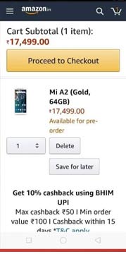 नई दिल्ली (टेक डेस्क)। शाओमी भारत में आज Mi A2 स्मार्टफोन लॉन्च करने की तैयारी कर रही है। इस फोन को आज शाम 4 बजे एक्सक्लूसिवली अमेजन इंडिया पर लॉन्च किया जाएगा। Mi A2 की लॉन्चिंग से पहले ही अमेजन पर फोन की कीमत लीक हो गई है। इस फोन को 17,499 रुपये में प्री-ऑर्डर किया जा सकता है। यह कीमत इसके 4 जीबी रैम और 64 जीबी स्टोरेज वेरिएंट की है। ऐसे में इसकी पहली सेल भी आज आयोजित की जाएगी।
