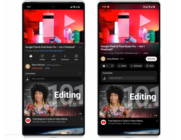 अब वीडियो विवरण में दिखने वाले YouTube लिंक बटन में बदल जाएंगे। इसके अलावा, डिस्ट्रेक्शन को कम करने के लिए लाइक, शेयर और डाउनलोड जैसे बटन को भी निचले हिस्से में ट्रांसफर कर दिया गया है। क्रिएटर्स के लिए अच्छी बात यह है कि कंपनी ने सब्सक्राइब बटन को ज्यादा हाईलाइट कर दिया है। यूजर अब एक अंडाकार सफेद बॉक्स में क्रिएटर्स के नाम के पास सब्सक्रिपिशन बटन देखेंगे।