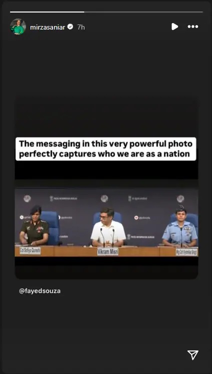 सानिया मिर्जा ने डिसूजा की एक पोस्ट साझा की, जिन्होंने कर्नल सोफिया और विंग कमांडर व्योमिका द्वारा की गई ब्रीफिंग पर प्रतिक्रिया व्यक्त करते हुए निम्नलिखित लिखा था। डिसूजा ने पोस्ट में लिखा था, इस अत्यंत शक्तिशाली फोटो में निहित संदेश पूरी तरह से दर्शाता है कि हम एक राष्ट्र के रूप में कौन हैं।