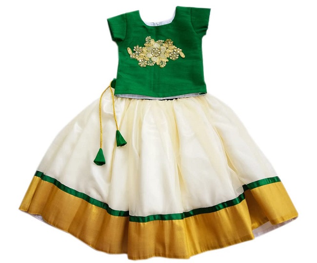 यह लहंगा चोली आपको ग्रीन और क्रीम कलर की सेल में मिल रही है। जो आपकी बच्ची पर बहुत प्यारी लगेगी। इसमें बागलोरी सिल्क के साथ गॉल्डन स्टोन का काम हुआ है। फुल लेंथ के इस आउटफिट को आप किसी भी फैसिटवल, शादी या पार्टी में अपनी बेटी को पहना सकते हैं। इसका फ्रैबरिक भी नायलोन और नेट का है।