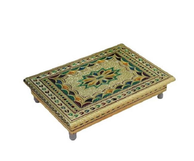 इसमें चौकी को रोकोमो के कुशल कारीगरों ने बनाया है और एक ट्रेडिशनल लुक दिया है। यह डिजाइनर चौकी नवरात्रि के अवसर पर माता की स्थापना के लिए ऑनलाइन खरीद सकते हैं। Handicrafts puja chowki Price: Rs 699.