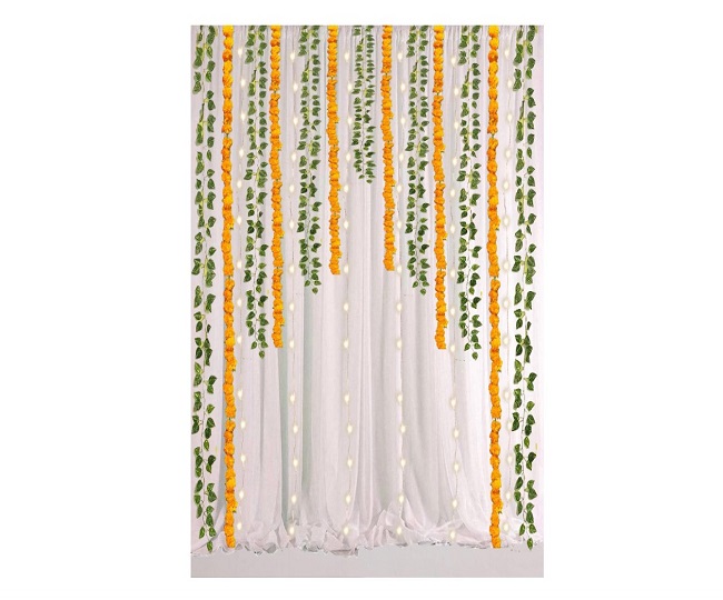 Ganesh Chaturthi 2023 के लिए इस डेकोरेशन आइटम में सफेद नेट पर्दे, एलईडी लाइट, कृत्रिम पत्तिया, हुक, रिबन और गेंदे की माला शामिल है। इसे नायलॉन, पॉलीप्रोपाइलीन और कपड़े से बनाया गया है।