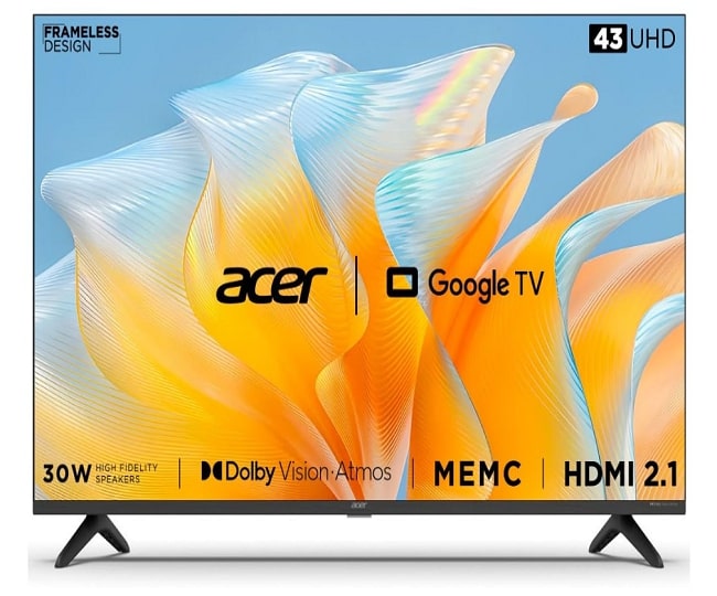 यह Acer Google अपने 4K अल्ट्रा एचडी डिस्प्ले और गूगल टीवी ऑपरेटिंग सिस्टम के साथ मनोरंजन का सहज अनुभव प्रदान करता है और इसमें डॉल्बी विजन और एटमॉस तकनीक, 2 जीबी रैम और 16 जीबी स्टोरेज है। यह 43 Inch TV नेटफ्लिक्स और प्राइम वीडियो जैसे लोकप्रिय एप्लिकेशन को सपोर्ट करता है और इसे 30 वॉट के हाई स्पीकर इमर्सिव ऑडियो के साथ पेश किया जा सकता है। इसे टेबल पर रखने के साथ-साथ वॉल पर भी माउंट किया जा सकता है। Acer Smart TV Price: Rs 22,999.