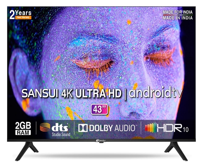 इस SANSUI Android TV को 3840x2160 पिक्सल के रिज़ॉल्यूशन और 178 डिग्री के बड़े व्यूइंग एंगल मिलता है डॉल्बी ऑडियो और डीटीएस स्टूडियो साउंड के साथ यह इमर्सिव सराउंड साउंड प्रदान करता है। यह 43 Inch LED TV एंड्रॉइड 10.0 ऑपरेटिंग प्लेटफार्म पर संचालित होता है और गूगल असिस्टेंट और एलेक्सा को भी सपोर्ट करता है। SANSUI Smart TV Price: Rs 25,132.
