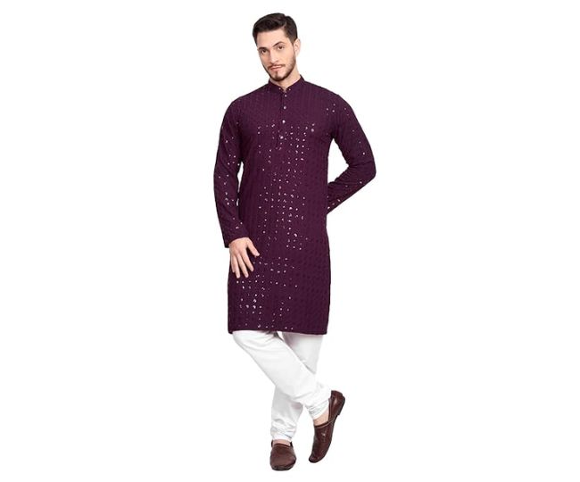 रेयान कुर्ता और पायजामा सेट आरामदायक फिट के साथ डिजाइन किया गया है। आप इस Dress For Men को बिना किसी परेशानी के पूरा दिन पहन सकते हैं। इस कुर्तें पर कढ़ाई वाला मिरर वर्क, फुल चिकनकारी सेक्विन वर्क किया है। पुरुषों के इस कुर्तें में आपको कई सारे कलर ऑप्शन और साइज मिल जाएंगे, जिन्हें आप अपनी पसंद के हिसाब से ऑनलाइन खरीद सकते हैं। Kurta Pajama Price: Rs 1,295.