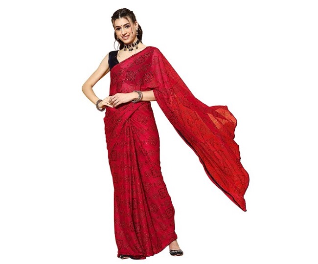 अगर आप बजट में अच्छी सी साड़ी लेना चाहती हैं, तो इस Latest Saree Collection को ले सकती हैं। इसमें मिलने वाली यह रेड कलर की साड़ी ब्लैक कलर के फॉयल प्रिंट के साथ आ रही है, जो इसको बांधनी प्रिंट लुक देता है।
