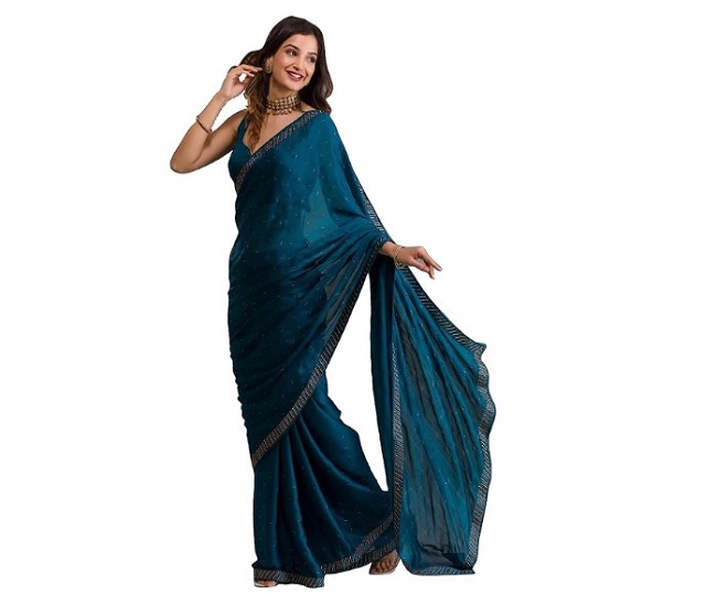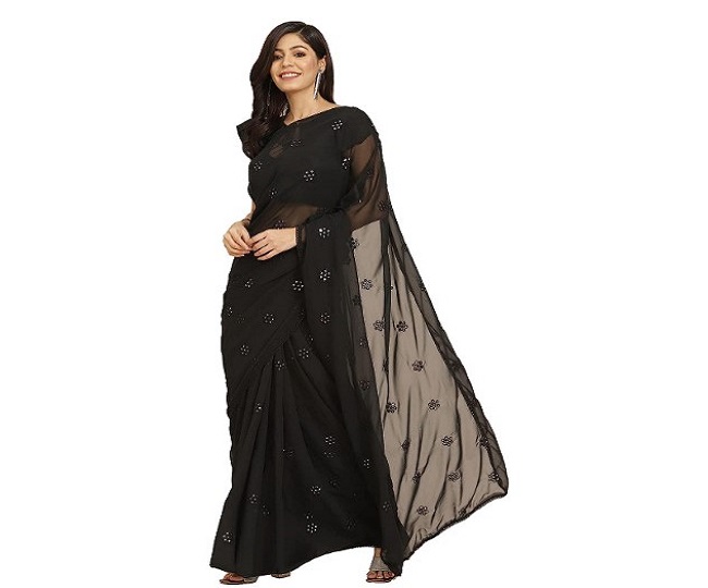 ब्लैक कलर आपका फेवरेट है, तो इस प्लेन साड़ी को ला सकती हैं। इस Party Wear Saree पर आपको छोटी-छोटी मिरर बूटी वर्क किया हुआ मिलता है, जो बहुत ही सुंदर है।