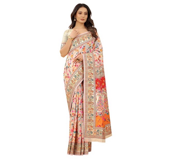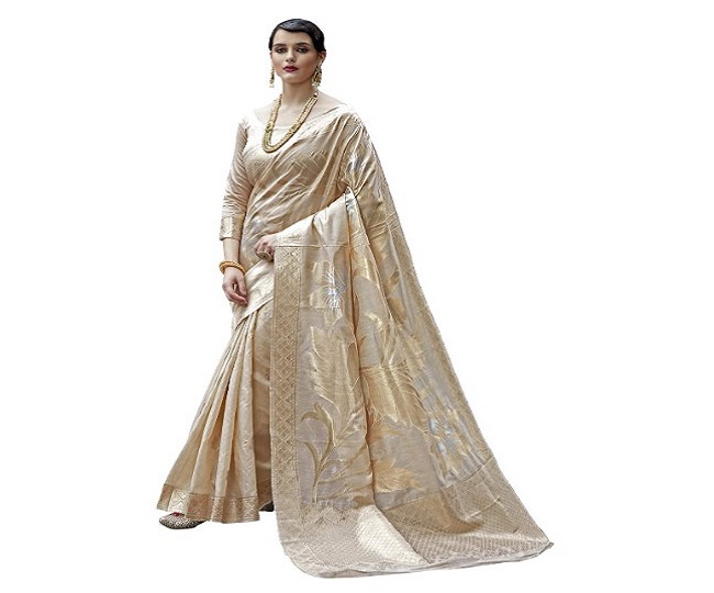रॉयल और क्लासी लुक के लिए यह Banarasi Silk Saree परफेक्ट है। इसको आप आराम से कैरी कर सकते हैं। यह साड़ी क्रीम और मैरून कलर में आती है।
