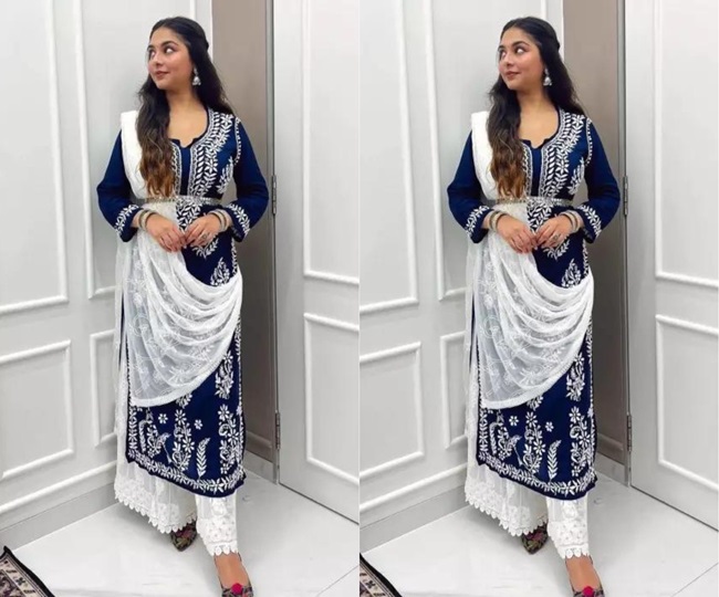 डार्क ब्लू कलर के साथ तैयार की गई लखनवी चिकनकारी कुर्ती का यह सेट काफी यूनिक और ऑशम लुक दे रहा है। विश्वास के साथ कहा जा सकता है, कि जो भी इसे पहनेगा, वे बखूबी खूबसूरत लगेगा। कुर्ती के पेंट पर, दुपट्टे पर और कुर्ती पर चिकनकारी वर्क मिल रहा है।