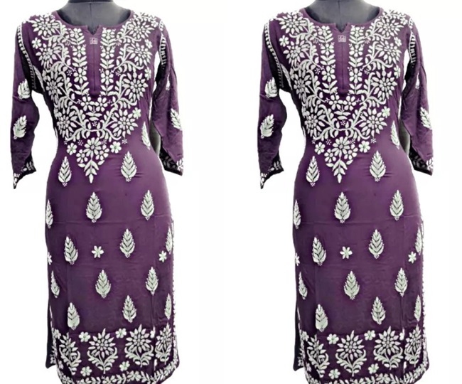 पर्पल कलर के लुक में यह कुर्ती को आप चुन सकती हैं। इसका डार्क शेड आपकी खूबसूरती को निखारेगा। इस पर किया गया चिकनकारी कढ़ाई में व्हाइट वर्क का काम काफी कमाल का लुक दे रहा है। इसके नेक यानि गले पर हैवी कारीगरी की गई है, जो इसकी शोभा बढ़ा रही है।