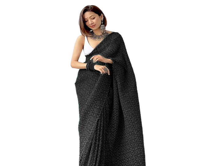 ब्लैक कलर की यह साड़ी प्योर जॉर्जेट फैब्रिक से बनी है। इस Black Saree का बहुत ही सॉफ्ट और स्मूद फैब्रिक है, जो स्किन पर कोई नुकसान नहीं पहुंचाता है।
