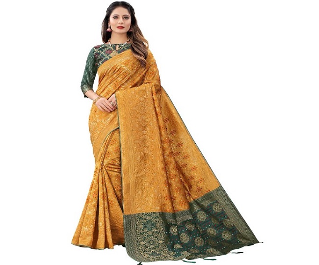इस Silk Saree को आप हेल्दी फंक्शन में भी पहन सकते हैं। यह आपको ट्रेडिशनल एथेनिक लुक देती है। रिसेप्शन और अन्य शादी के फंक्शन के लिए यह बहुत ही खूबसूरत साड़ी है। Leeza Women's Saree Price: Rs 859.
