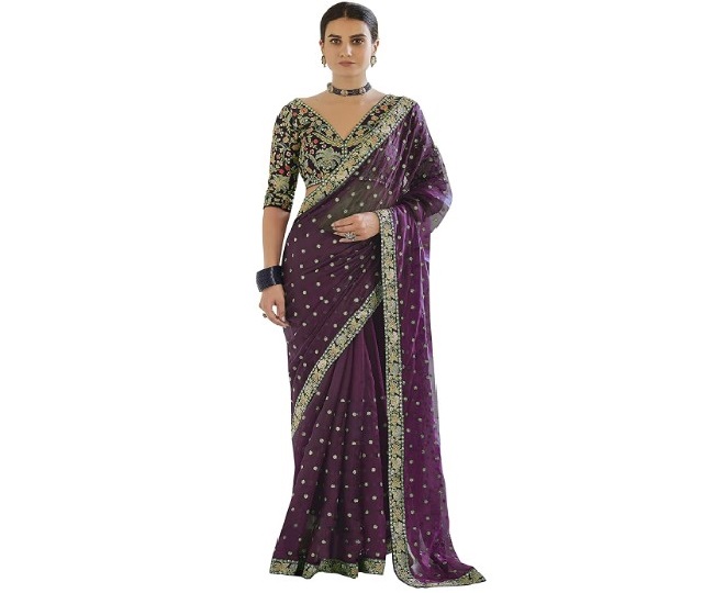 यह जॉर्जेट साड़ी बहुत ही सुंदर है। इस पर सीक्वेंस वर्क है, जो बहुत ही खूबसूरत है। यह Bridal Saree For Wedding मैचिंग ब्लाउज के साथ आती है।