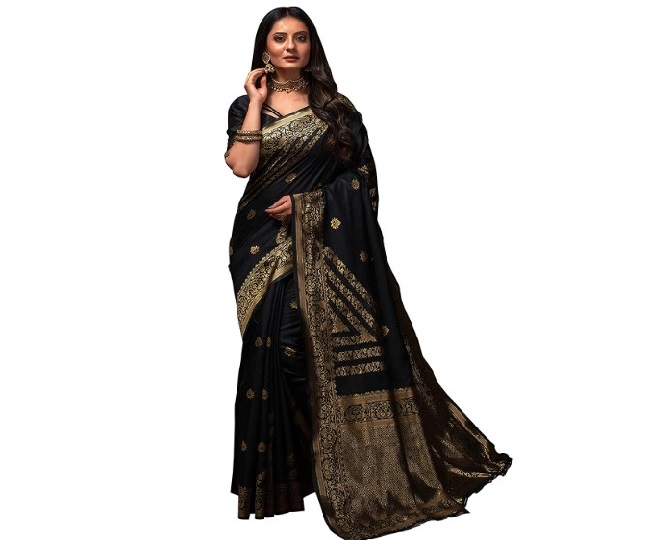 ब्लैक कलर की Saree Silk आज कल बहुत ट्रेंड में रहती है। इस पर गोल्डन जरी वर्क किया हुआ है, जिसको आप गोल्डन ज्वेलरी के साथ पेयर कर बहुत ही अच्छा लुक पा सकती हैं।