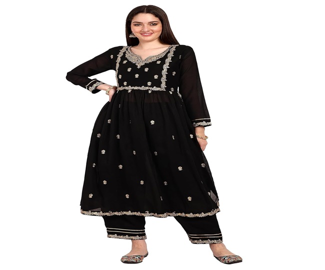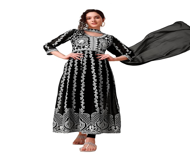 यह Black Suit Design चिकनकारी दिखने में काफी ज्यादा स्टाइलिश है और इसमें आपको एक कुर्ता और एक दुपट्टा भी देखने को मिलता है। इसे अनारकली कुर्ता भी कहां जाता है। इसमें साइज और कलर दोनों के काफी ज्यादा ऑप्शन आपको मिल रहे है। Ladies Suits Price: Rs 499.