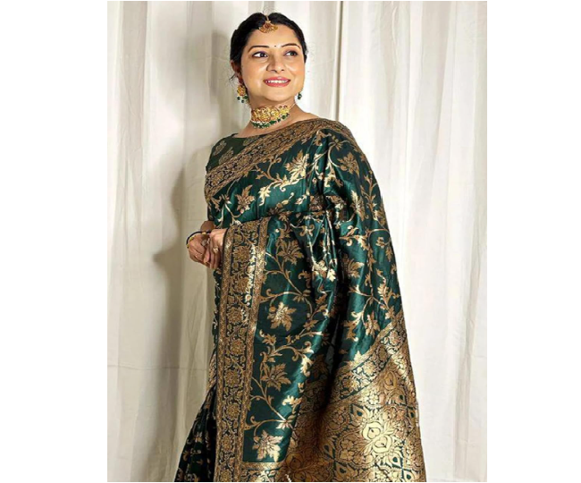 करवा चौथ पर रेड कलर के अलावा और भी कलर के ऑप्शन देख रही हैं, तो इस ग्रीन कलर की Karva Chauth Special Kanjivaram Saree को आप अपनी वार्डरॉब में लिस्ट कर सकती हैं।