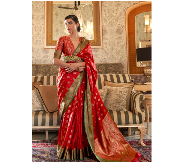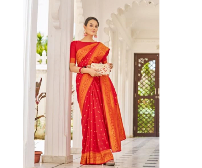 यह साड़ी रेड कलर के अलावा और भी कलर ऑप्शन में मौजूद हैं। इसकी लंबाई 5.50 मीटर है, वहीं ब्लाउज 0.80 मीटर लेंथ में आता है। SGF11 Kanjivaram Silk Saree For Women Price: Rs 1599.