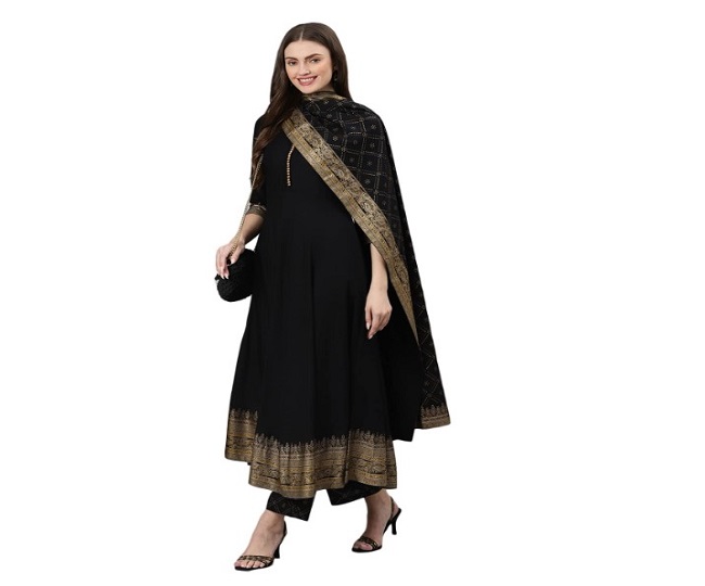 इस ब्लैक कलर के Women's Kurta Set की जितनी तारीफ की जाए, उतना ही कम है। यह सभी साइज में आ रहा है। इस पर गोल्डन वर्क किया हुआ है।