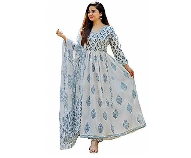 यह सभी साइज ऑप्शन में आ रहा है। इसका अंगरखा स्टाइल है, जो बहुत ही खुबसुरत लुक देता है। इसकी ¾ स्लीव है। MEERA FAB Women's Kurta Set Price: Rs 679.