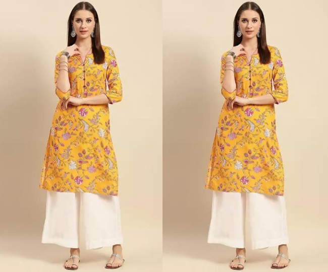 100% कॉटन फेब्रिक के साथ येलो कलर का प्रिंटिड कुर्ता काफी बढ़िया लुक देगा। इस पर कमाल की कारीगरी देखने को मिलेगी, जो फूलों की गई है। यह कुर्ता स्ट्रेट कट है, जिसे महिलाएं अक्सर पसंद करती है। इस कुर्ती को जींस, पजामी और प्लाजों के साथ बखूबी कैरी किया जा सकता है।