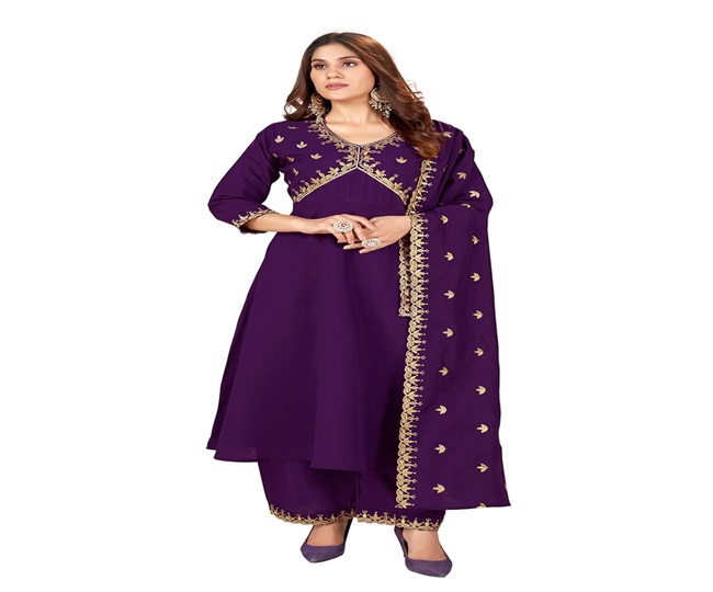 पर्पल कलर में यह अनारकली कुर्ता सेट पहनकर आप सचमुच की अनारकली लगेंगी। इसका खूबसूरत लुक आपके फैशन को अपग्रेड करेगा। इसका मैटिरियल सिल्क का है, जो आपके बॉडी के लिए काफी सॉफ्ट रहेगा।