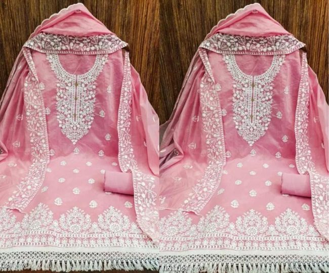 अब इस पिंक कलर के डिजाइन सूट को देखिए, जिसका लुक काफी ऑसम है। यह बिना सिला हुआ सूट है, जिसे अपने साइज और डिजाइन के अनुसार सिल्वा सकती है। इसकी सलवार को आप फुलकारी बनवा सकती है।